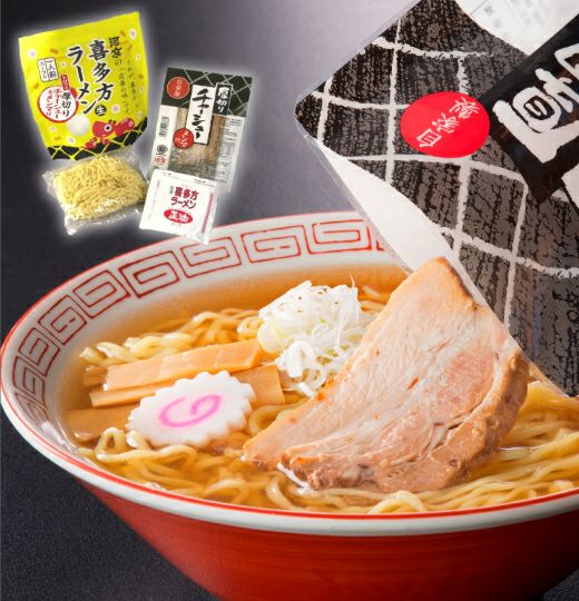 1食分の喜多方ラーメンに、低温でじっくりと煮込んだ柔らかい厚切りチャーシューとメンマをセットにいたしました。