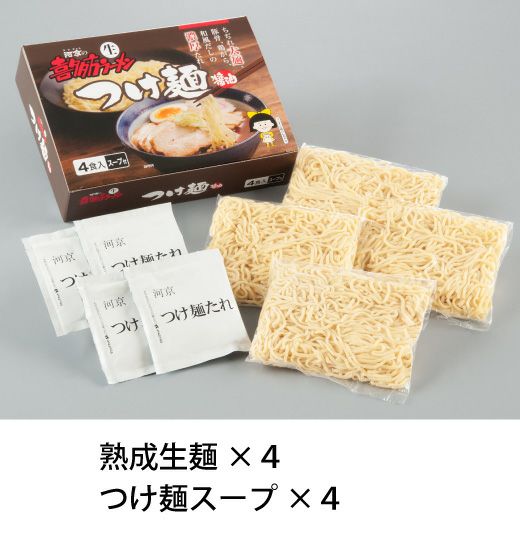 つけ麺スープ:醤油(国内製造)、砂糖、ポークオイル、ポークエキス、食塩、濃縮だし(いわし煮干し、さば節、かつお節)、チキンエキス、醸造酢、香味油、煮干しエキス、香辛料、さば節/調味料(アミノ酸)、酒精、カラメル色素、増粘剤(キサンタン)、酸化防止剤(V.E)、(一部に小麦・さば・大豆・鶏肉・豚肉・ゼラチンを含む)