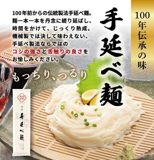 江戸時代より受け継がれる伝承技法を守り続け麺一本一本にまごころ込めて仕上げた商品で吟味厳選された小麦粉を使用し、長時間熟成させて作り上げました。小麦本来の香りと味、つるりとした舌ざわり、もっちりとしたコシをお愉しみください。