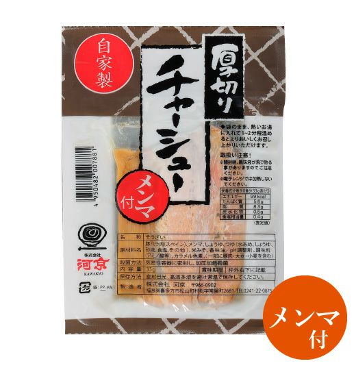 手間暇をかけた自家製厚切りチャーシュー自慢の自家製チャーシューを使いやすく1枚切にパックしました。トロッと柔らか、常温保存で使いやすいチャーシューです。さらにメンマが付いてます!
